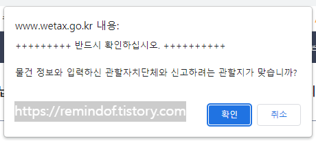 관할자치단체가 맞는지 확인하라는 경고창을 확인할 수 있습니다.