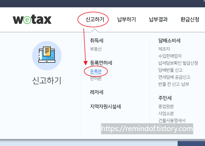 상단 메뉴에서 [신고하기 > (등록면허세) 등록분]을 클릭합니다.