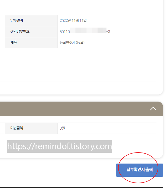 이제 [납부확인서 출력]을 클릭하여 [등록면허세 영수필 확인서]를 출력합니다.