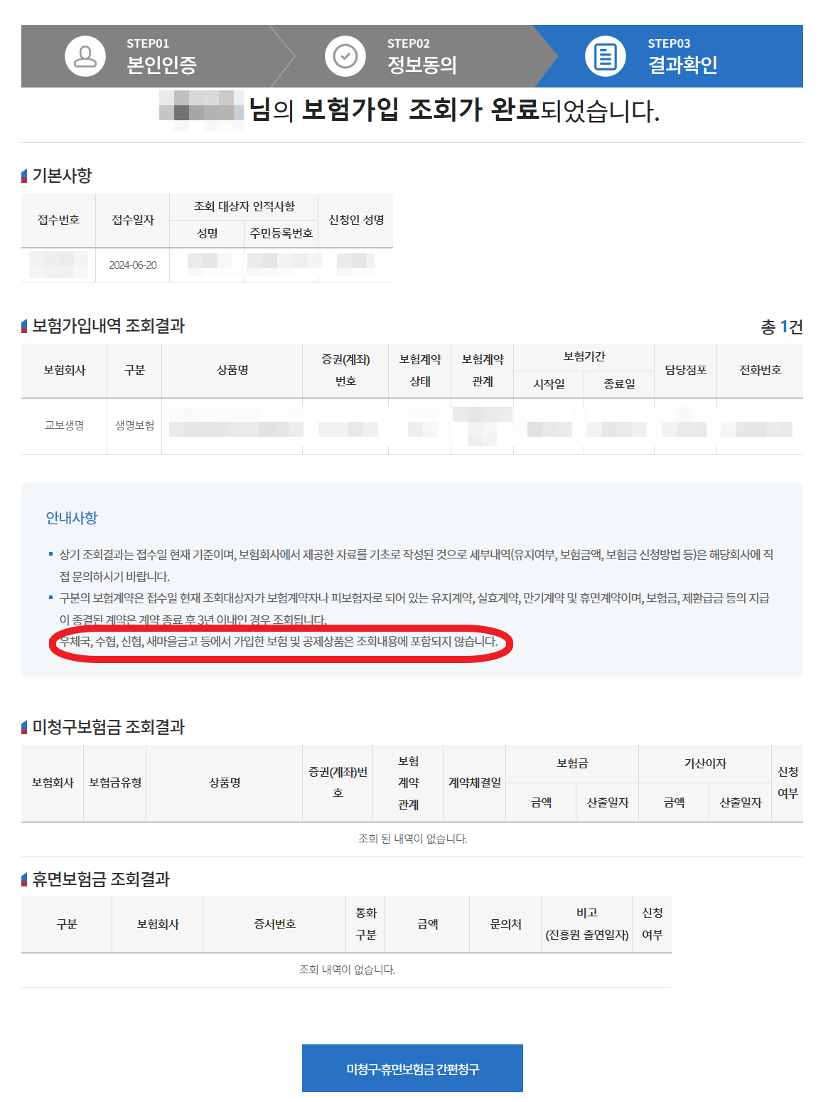 우체국, 수협, 신협, 새마을 금고에서 가입한 보험이나 공제상품은 이곳에서 확인할 수 없습니다.