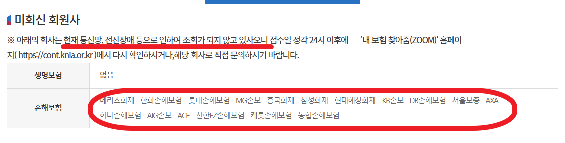 마지막으로 가끔씩은 조회할 수 없는 보험사도 있습니다.
