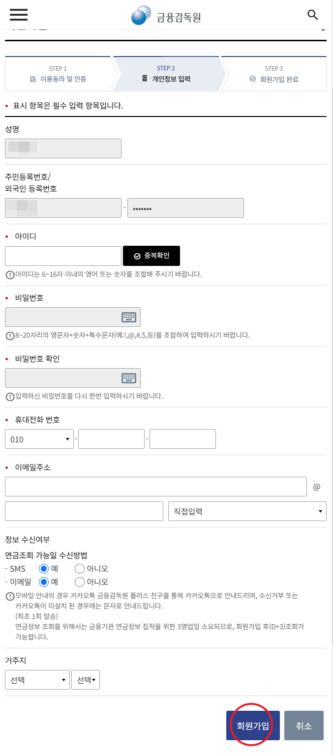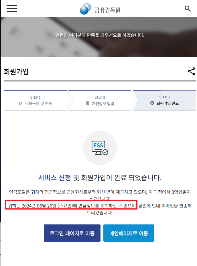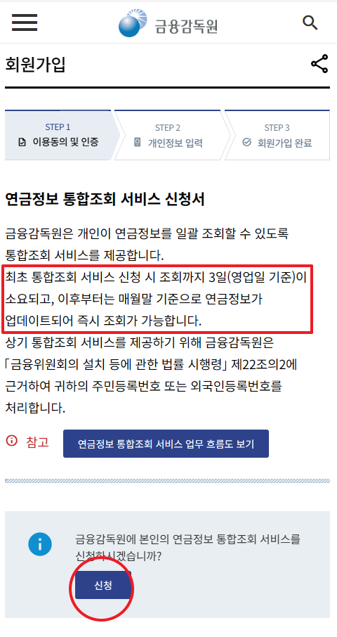 회원 가입 전이라면 [연금정보 통합조회 서비스] 신청을 해야 합니다.